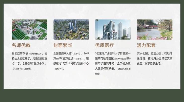 省实荔湾学校(花地湾校区)、协和幼儿园已开学,出家门即入校门。周边3公里范围内,更汇聚了3所省重点中学及5所省/市重点小学。这种全龄段的教育链条,为孩子构建了从启蒙到进阶的完整成长路径。我们致力于让知识的光芒,照亮孩子通往未来的每一步。(注:开发商不作入学承诺,具体以教育局当年招生政策为准)。
