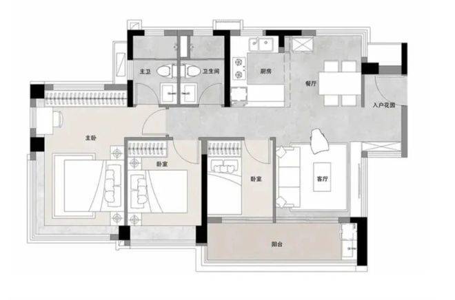 约84平三房两卫:四开间朝南,双阳台设计,主卧套房带L型飘窗,次卧灵活可改横厅,满足年轻家庭需求。