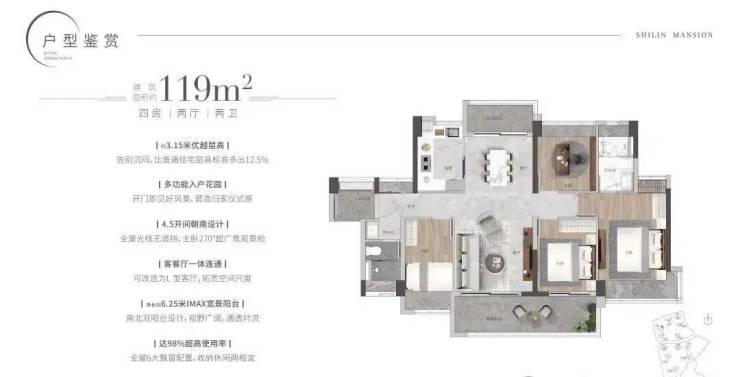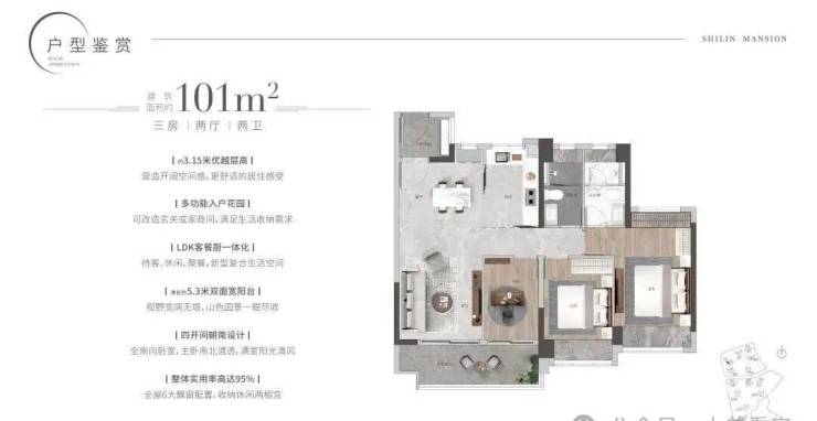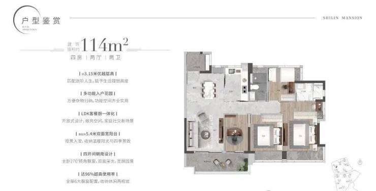 主力在售的是101㎡三房和114㎡、119㎡四房。以114㎡为例,南北通透,主卧带独立卫生间和L型飘窗,次卧与客厅共享阳台,空间几乎没有浪费。厨房U型布局,预留双开门冰箱位;公卫干湿分离,细节处理比同价位不少项目更周到。值得一提的是,全盘层高在3.15米至3.3米之间,实际看房时层高带来的通透感确实加分。