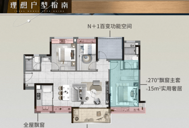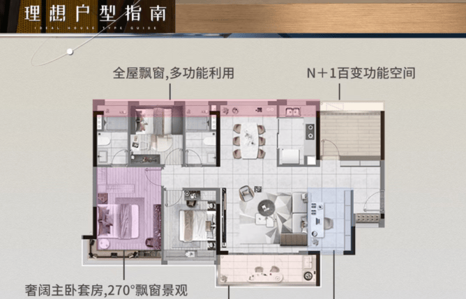 采用LDK布局,连通270°朗阔阳台,南北对流主卧套房,L型瞰景飘窗