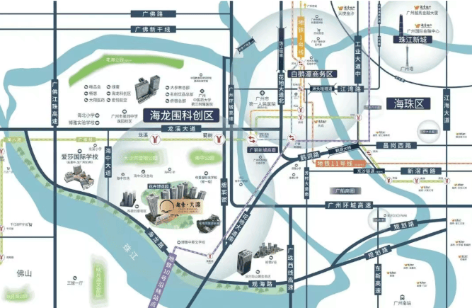 越秀·天瀛位于荔湾区海龙科创区,距离广钢新城仅3公里,强调打造广钢2.0版本。尽管该项目距离白鹅潭核心区域较远,但其所处位置仍然享有丰富的自然资源和便捷的交通条件。项目周边环绕着花艺博览园、大沙河湿地公园等自然景观,为居民提供了舒适的居住环境。