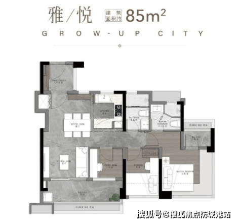 3. 85㎡(二期加推):三空间两卫,全南向设计,户型方正,采光充足,空间布局合理,动静分区明确,客厅宽敞明亮,搭配景观阳台,主卧带飘窗,能够满足三口之家的居住需求,性价比高,贴合刚需改善群体需求。