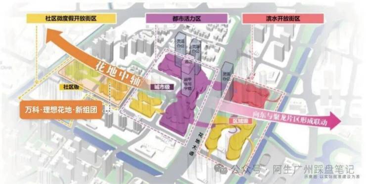 万汇天地整体规划 **“一轴三街区”:花地中轴自西向东串联社区级微度假开放街区、城市级都市活力区、区域级滨水开放街区 **,集居住、商业、休闲、生态于一体,建成后将成为广州规模最大、配套最全的城市更新标杆项目。