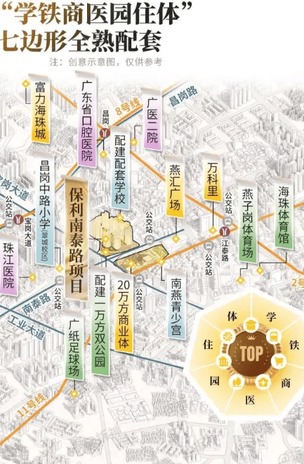 交通出行方面,项目坐拥海珠西四通八达的路网。地块东临江南大道,西靠宝岗大道,这两条城市主干道可快速接驳内环路、工业大道等,无论是前往珠江新城CBD还是白鹅潭商务区,都十分便捷。更令人惊喜的是,项目周边2公里范围内汇聚了地铁2号线、8号线、11号线(在建)以及广佛线共4条地铁线路。这意味着,无论是日常通勤还是周末出游,业主都能享受到高效、多元的公共交通选择,极大地拓展了生活的半径。