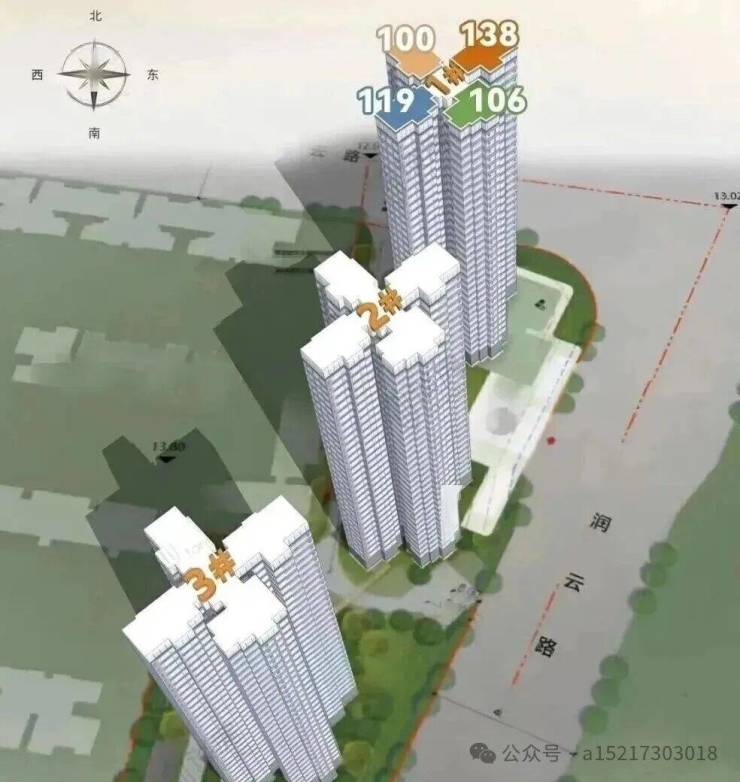 布局特点:3 栋塔楼一字排开,东南向无遮挡,高层可远眺白云山,每户采光与视野均衡,无明显遮挡。