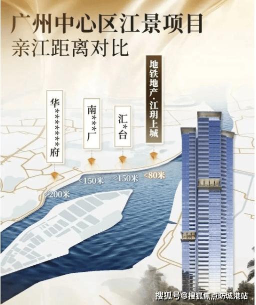 答:项目距珠江仅约 80 米,有 1 公里江岸线、800 米宽江景面、270° 环幕视野,江景资源优越;社区整体抬高 16 米退台式排布,大部分楼栋可南向望江,部分户型为环幕江景美宅,看江效果好。