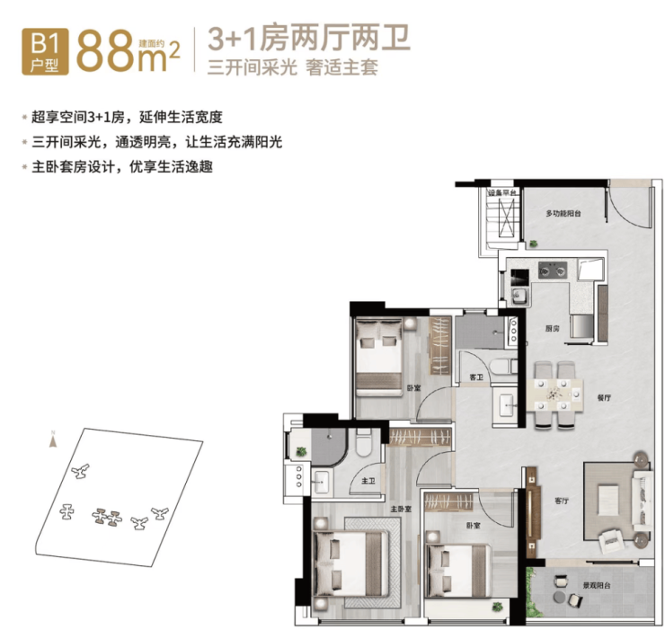 88㎡3+1房:南向园景,实得面积超95㎡,三代同堂无忧;