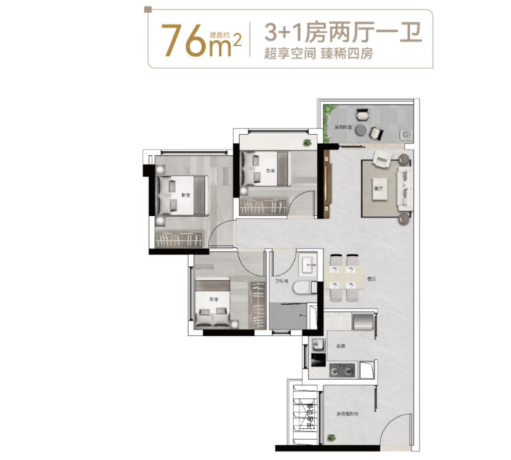 76㎡3+1房:北向山景,总价约320万起,低总价晋阶天河;