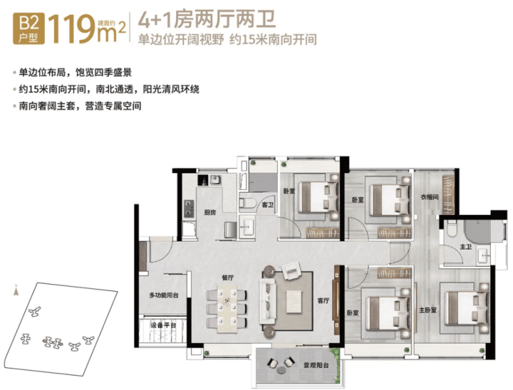 119㎡4+1房:双主卧套房设计,赠送入户花园,实得面积超105㎡;