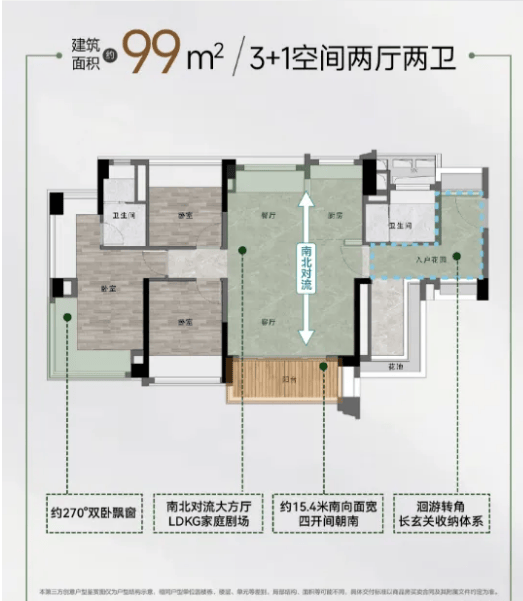 99-108平四房两卫户型,总价240万起,针对改善型家庭打造。四房布局可满足二胎家庭或三代同堂的居住需求,空间通透,采光均匀,客厅连接大阳台,延伸室内空间视野;厨房采用U型或L型设计,操作空间充足,方便日常烹饪,部分户型预留储物空间,满足家庭收纳需求。