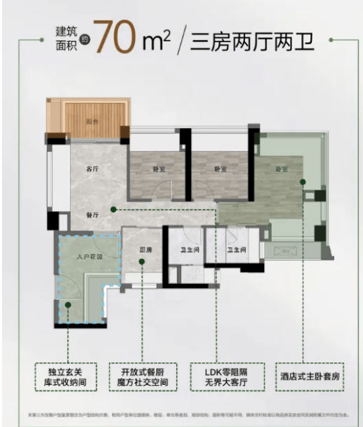 70/73平北向三房户型,总价150万起,是刚需群体的优质选择。该户型虽面积紧凑,但布局合理,无浪费空间,三房设计可满足小家庭居住或刚需过渡需求,北向采光充足,通风效果良好,精装交付标准省去装修繁琐,性价比极高。