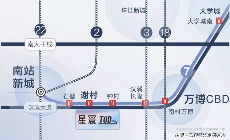 地铁7号线:贯穿广州南站、汉溪长隆、万博CBD、大学城,直达黄埔科学城,串联番禺核心发展轴;