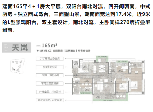 建面165㎡4+1房大平层:双阳台南北对流,四开间朝南,中式厨房+独立西式岛台,三面望山景,近9米的L型景观阳台,双主套设计,南北对流。