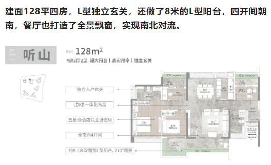 建面128㎡四房:L型独立玄关,8米的L型阳台,四开间朝南,餐厅也打造了全景飘窗,实现南北对流。