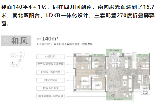 建面140㎡4+1房:四开间朝南,南向采光面达到15.7米,南北双阳台,LDKB一体化设计,主套配置270度折叠屏飘窗。