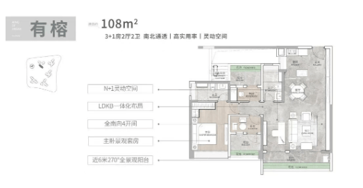 建面108㎡三+1房:四开间朝南,近6米的南向阳台,LDKB一体化设计,5.9米的大方厅,奢阔大主套设计,配置南向大飘窗,独立卫浴,L型衣帽间。