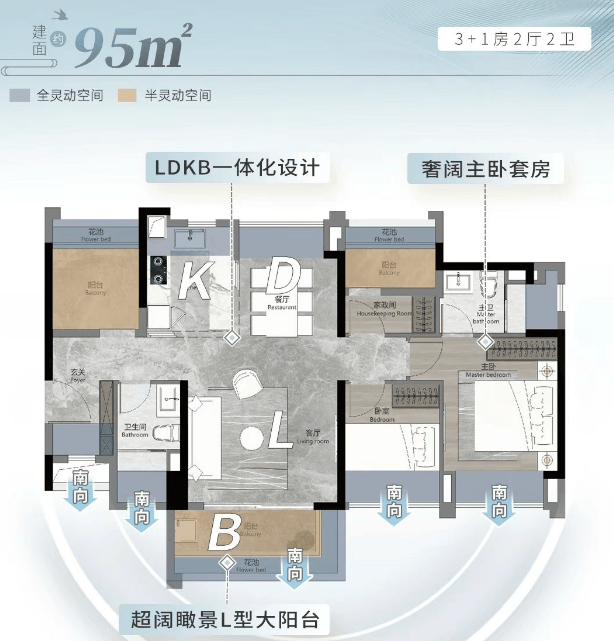 95㎡四房两厅两卫:五开间朝南,超阔瞰景阳台,奢阔私密主卧套房,南北对流设计。