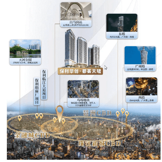 保利华创・都荟天珺周边配套成熟,能充分满足业主高品质生活需求。商业方面,项目临近珠城东区领展广场及周边底商,3 公里范围内有正佳广场、天河城、天环广场、太古汇等高端商业体;未来随着马场地块改造(对标北京 SKP),将进一步补充高端商业资源。医疗方面,周边有华侨医院、中山三院、中山六院、南方三院、天河中医院等多家三甲医院,健康保障充足。生态方面,项目直线距离天河公园约 1 公里,可享受 “天然氧吧”,日常休闲散步便捷。