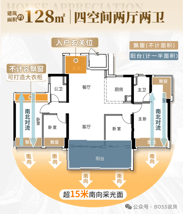 建面约100平方米、101平方米户型,总价160万起,为二期新规主力户型,四房设计,依托新规优势,实现空间利用率的最大化。该户型格局方正,南北通透,四开间朝南,采光通风效果拉满,动静分区、干湿分离设计,公共活动区与私密休息区完全分离,互不干扰,保障居家生活的私密性与舒适度。户型配备南向景观阳台,可直面社区园林与江景,同时预留充足的收纳空间,适配三口之家或改善型家庭居住需求。