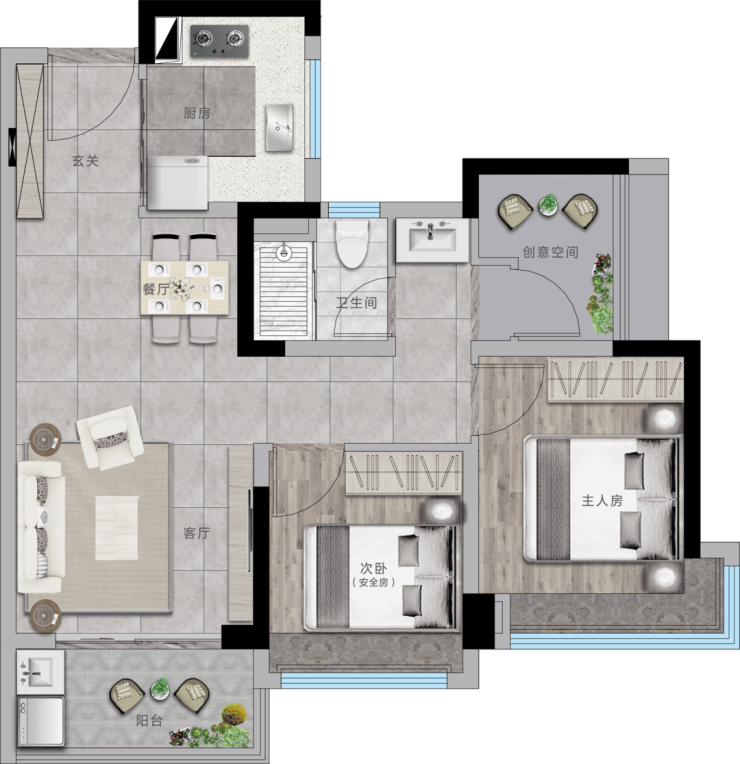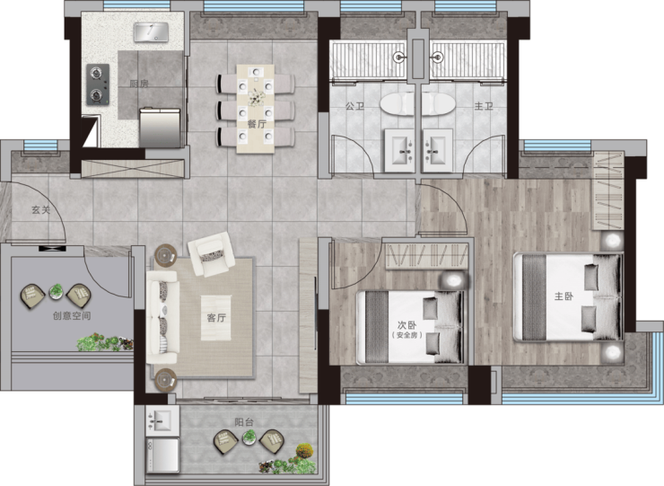 其建面约82㎡3房2厅2卫户型,四开间朝南、全南北对流、双卫浴配置,主卧南北双飘窗(南侧为270°飘窗),做到了市面常常130㎡才有的空间布局。