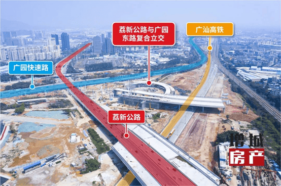 ▲荔新公路与广园东路复合立交建设进度实景 图源增城房产