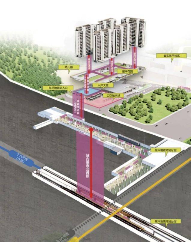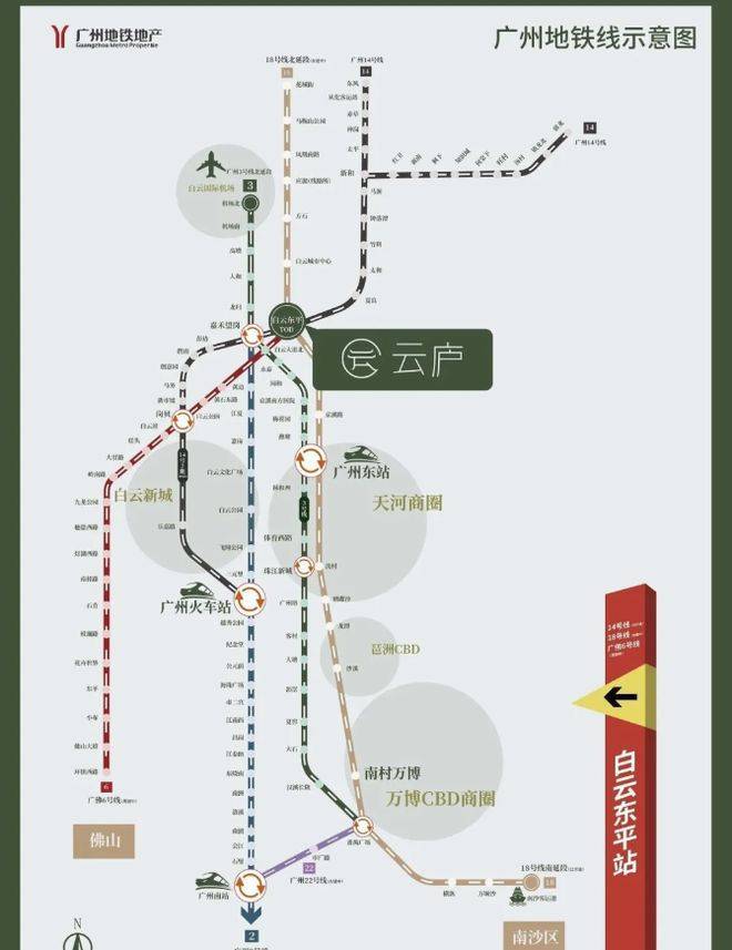 交通优势显著。项目所在的白云东平站,是三轨道汇集的 TOD 枢纽。18 号线高速地铁时速 160 公里,作为跨市域地铁线,串联广州东站、琶洲等核心 CBD 区,畅达大湾区多个城市。14 号线已开通,一站可达 2/3 号线嘉禾望岗站,5 站到机场,延线直达广州火车站。佛山 6 号线规划中,联通广佛城际交通。此外,白云东平站和公交总站上盖,还有专属地铁归家通道,无论选择地铁还是公交,都能舒心便捷归家,无惧风雨温差,极大提升出行体验。