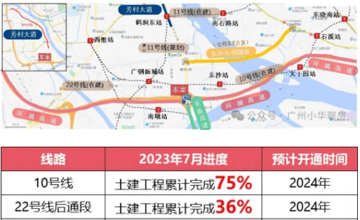 地铁11号线鹤洞东站(已开通):广州首条环线,贯穿荔湾、海珠、天河、越秀四大核心区,直达琶洲、广州东站。