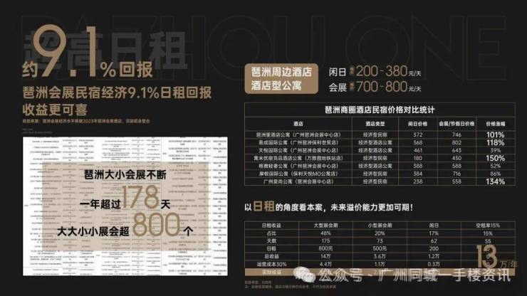 2023年琶洲展会全年举办800场,共178天,以会展租价计算,一年最高可达13万/年超高收益,民宿经济约 9.1%日租回报 更可喜!