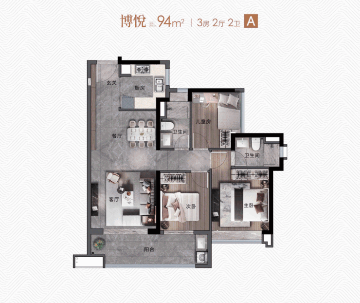 A户型:94平方米三房两厅两卫 采用传统的竖厅设计,格局方正,动静分区明确,户内基本无浪费空间,实用率较高。南北对流的布局使得通风效果极佳,加上超6米长的阳台贯通客厅与次卧,确保了充足的活动空间和良好的采光条件。