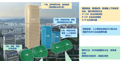 楼宇数量: 包含T1超甲级写字楼、T2和T3甲级写字楼以及多个总部大厦