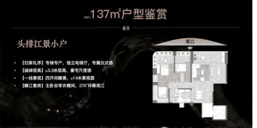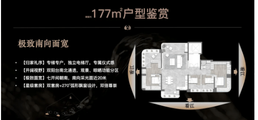 空间设计:实测得房率超 103%,纯南向江景,客厅面宽 5.5 米,搭配 8 米 IMAX 阳台(直面三江汇流),观景效果震撼;主卧套间(带独立书房与双卫浴),另外四间卧室均带飘窗,预留保姆房与独立储物间,满足塔尖人群居住与社交需求;