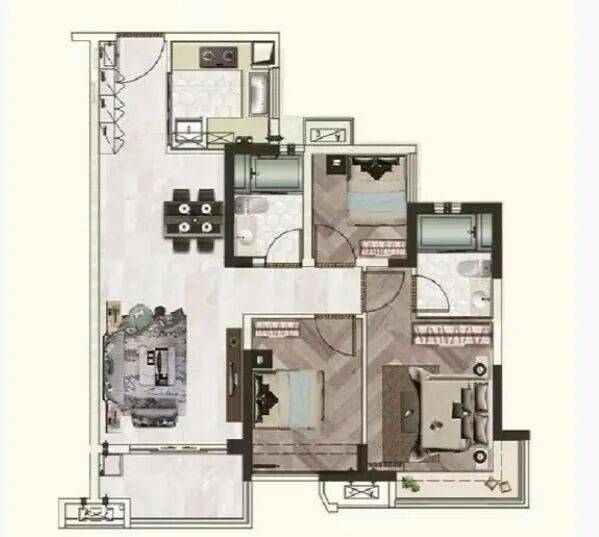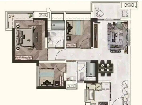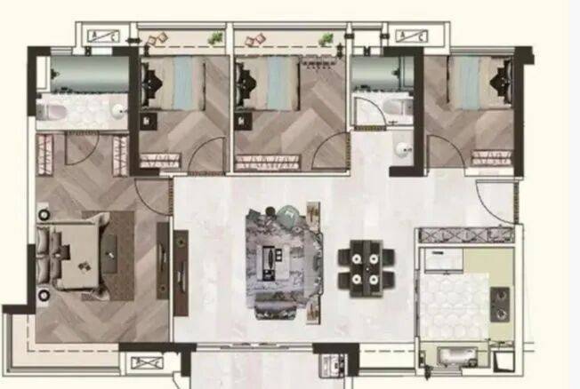 103㎡ 4室2厅2卫:四房的设计,适合二孩家庭或三代同堂。各个房间尺度适宜,更好地满足不同家庭成员的生活需求。