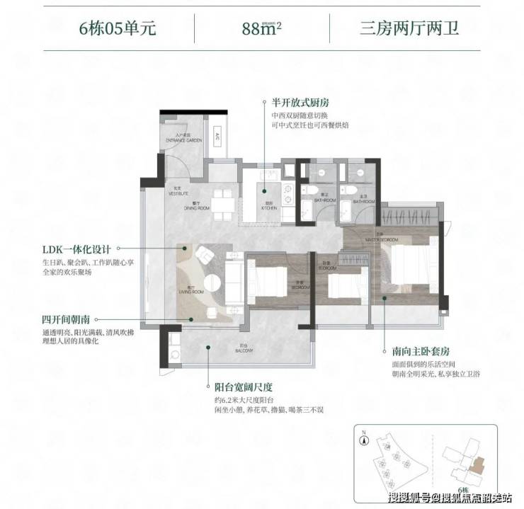 89㎡三房两厅一卫:南向主卧+双阳台设计,得房率86%;