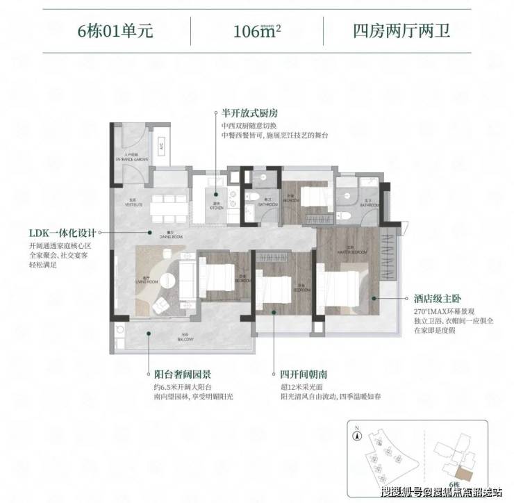 125㎡四房两厅两卫:主卧套房带衣帽间,270°转角窗瞰园林。