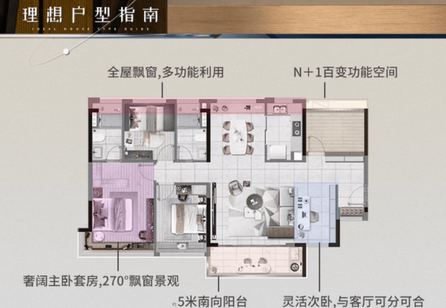 建面约104㎡:3+1创意空间2卫,南向4.5开间,舒适采光,使用率约96%,超宽横厅设计,连通270°朗阔阳台。