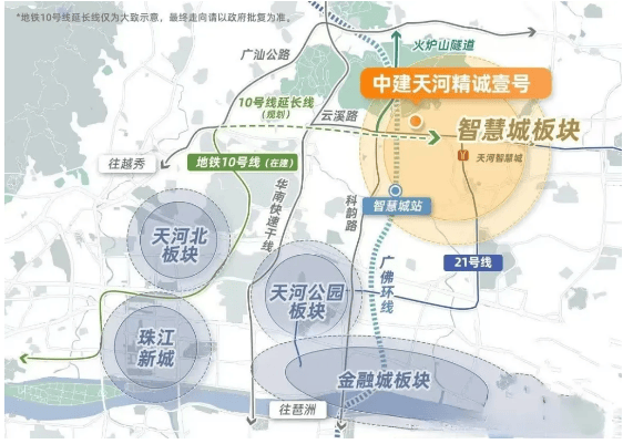 中建精诚壹号坐落于天河智慧城板块,地处广州第三中轴之上,属于粤港澳大湾区科技创新走廊首要节点,周边聚集小鹏、网易、中国移动等 2800 多家高精尖科创企业,汇聚超 25 万高知人才,板块发展潜力显著。交通方面,自驾优势突出,毗邻科韵路、华观路,临近华南快速、沈海高速出入口,火炉山隧道开通后,15-30 分钟可达珠江新城、金融城、琶洲;地铁规划有 10/30 号线交汇站华观站(距项目约 600 米),当前可通过打车或电瓶车接驳 21 号线天河智慧城站(约 1.8 公里),适合自驾通勤人群。