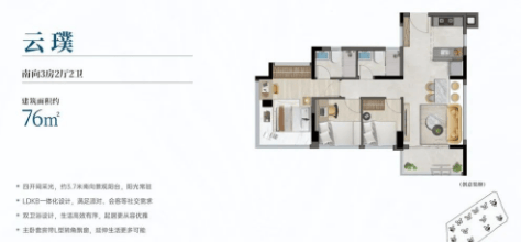 建面约76㎡三房两卫:紧凑实用的小户型设计,适合刚需家庭。户型方正,空间利用率高,采光充足。