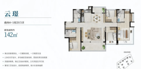 建面约142㎡五房两卫:大户型设计,空间宽敞舒适,适合大家庭居住。客厅与餐厅相连,形成开放式的公共区域,增强了家庭成员之间的互动性。
