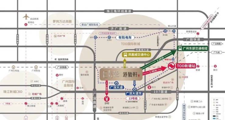 港骏轩项目位于广州东部中轴区位,广园大道以南,广深大道北面,荔新大道西侧,是广州连接东莞、深圳、澳门、香港的黄金走廊,是城市东进的首站,占据新塘经济核心开发区位!港骏轩是新塘最近高速出口的小区,出入市区主干道选择最多的小区,2分钟上高速(30分钟秒到天河白云黄埔),3分钟上广园,出门就是广深大道107国道,位于沙村和白江双地铁站中间位置,40分钟直达珠江新城。5分钟到新塘TOD,未来十轨交汇,一小时畅游珠三角生活,领航湾区速度,随着新塘穗莞深城轨开通,公共配套的同城化,以及地价的水涨船高,项目升值潜力巨大。