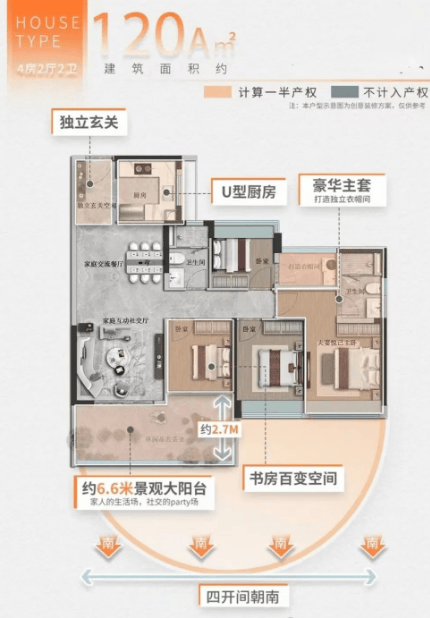 140㎡四房全景大宅:南北对流、通透宽敞,配备约9.4米跑道式大阳台,提供奢华居住体验。
