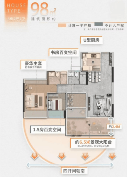 98㎡三房两厅两卫:书房改造后进深达到6米,适合双胞胎家庭;景观阳台延展至6.5米。