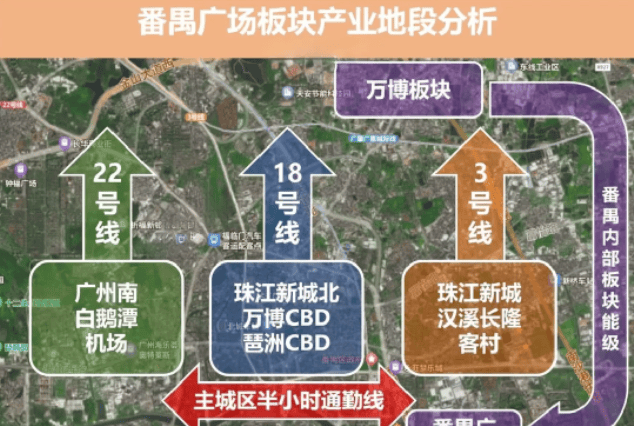 本项目所在的区域,被业界誉为“北万博,南区府”。这一地理定位并非简单的方位描述,而是对区域功能分层的精准概括。“北万博”代表了商业与产业的极致繁荣,而“南区府”则象征着行政资源的集中与城市界面的高度成熟。番禺广场板块,正是这一“双芯”格局中的关键节点。