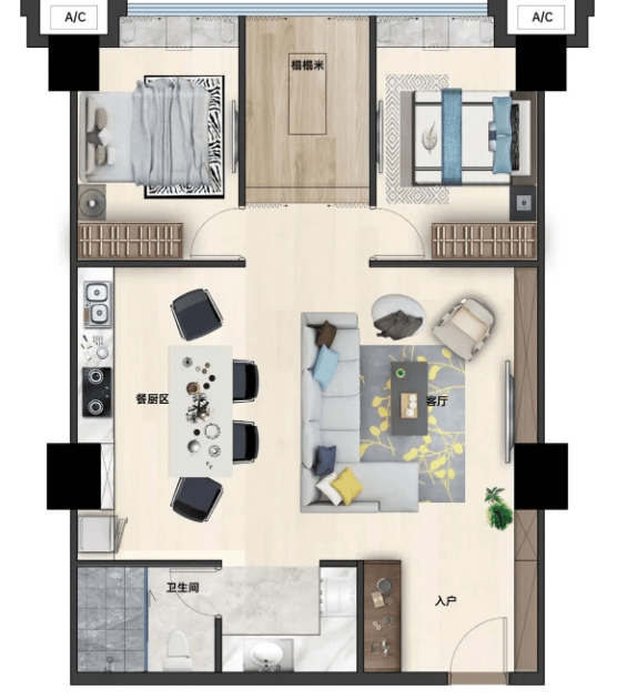 104㎡户型为2+1创意户型,空间灵活度高,可根据自身需求灵活改造,满足不同的居住及使用需求,适合家庭人口较多的自住人群,或作为高端出租房源,面向企业高管、大家庭等租客群体,价值凸显。