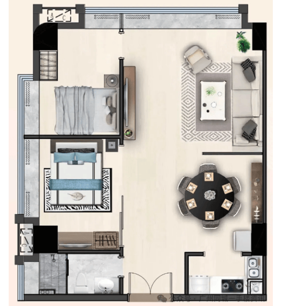 48㎡户型为一房一厅设计,空间更宽敞,客厅、卧室分区明确,采光通风良好,拥有独立的阳台和厨房,居住舒适度更高,适合单身精英或小两口自住,也可作为工作室使用,实现居住+工作一体,高效利用核心区资源。