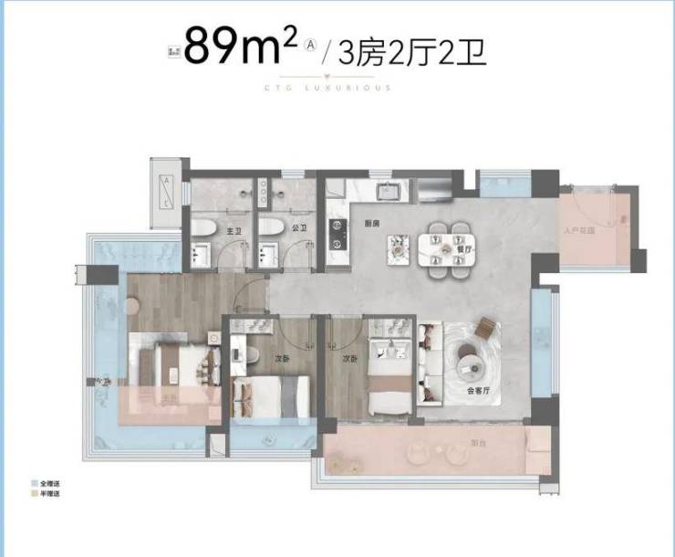 89㎡ 三房两厅两卫(南向阳台,得房率81%)