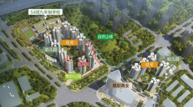 配建设施:54班九年一贯制学校、双幼儿园、规划公园、商业