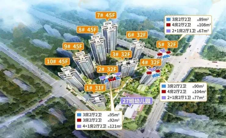 建筑规划上,项目共包含25栋住宅,层高从33层至47层不等,容积率仅为2.8,绿化率高达35%,在保证密度的同时兼顾了社区的宜居尺度与生态氛围。