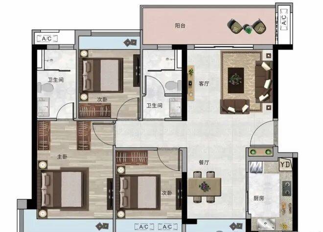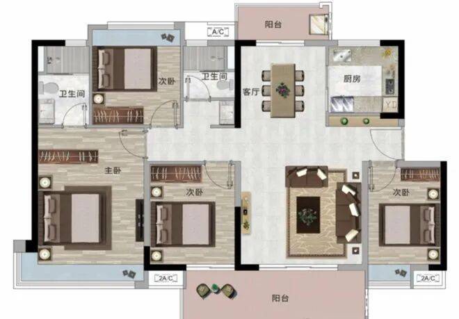 约126 - 138平方米户型:南北通透,双阳台设计,通风采光俱佳。主卧约270°转角飘窗,南向约6米大阳台,带来高品质的居住体验。
