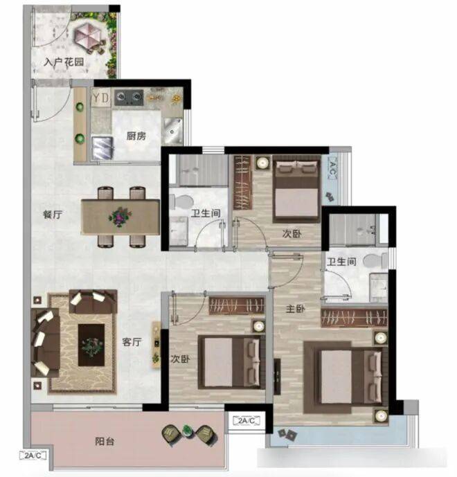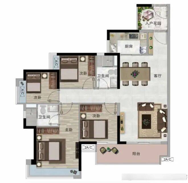 约118 - 119平方米户型:带入户花园的南向大四房,三开间朝南,保证充足光照。超大南向阔景阳台,让住户私享阳光与风景。