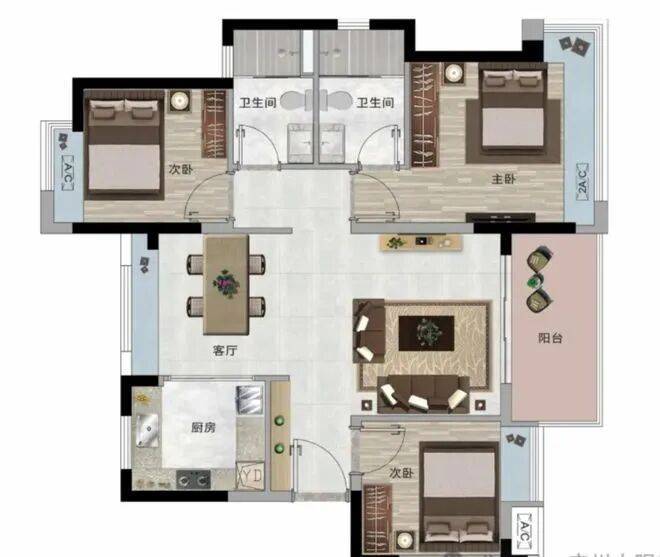 约95平方米户型:南北对流,双花园视野,四大飘窗空间全赠送,增加实用面积。三开间朝南,保证充足采光,主卧约270°转角飘窗提升采光效果。